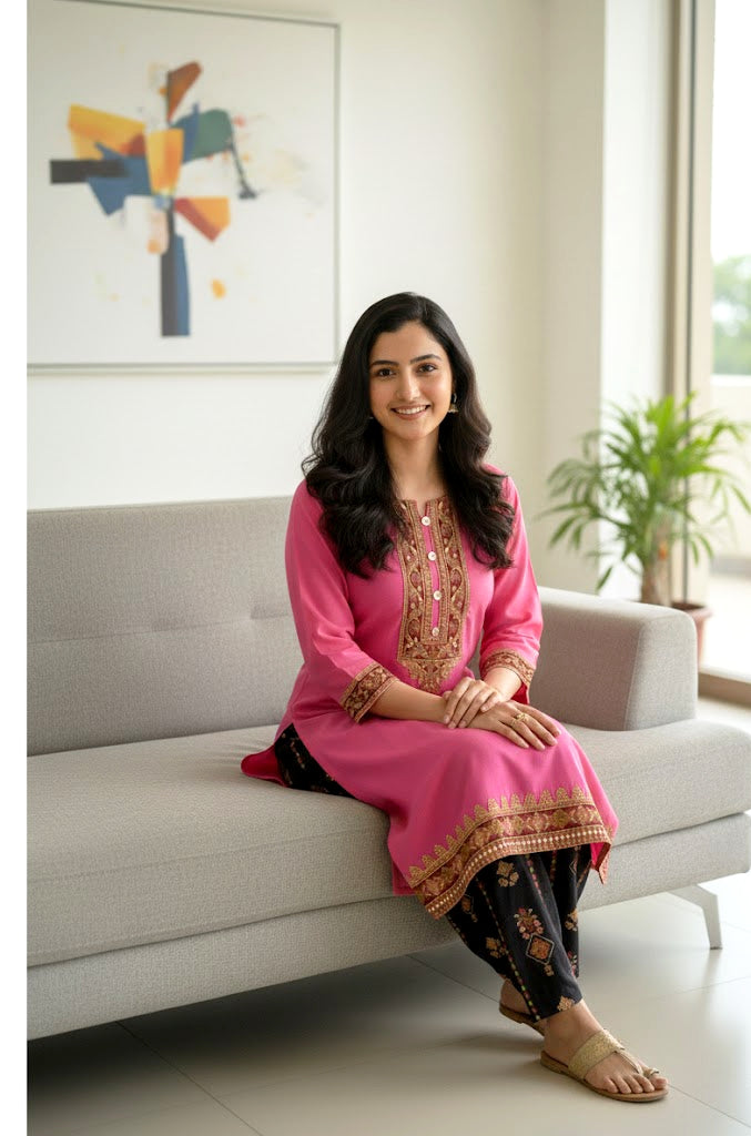 Add a touch of elegance to your everyday wardrobe with this beautifully designed pink embroidered lawn outfit. The soft lawn shirt features intricate embroidery on the neckline, sleeves, and hem, giving it a graceful and refined look. The delicate detailing enhances the overall charm while keeping it perfect for both casual and semi-formal wear.